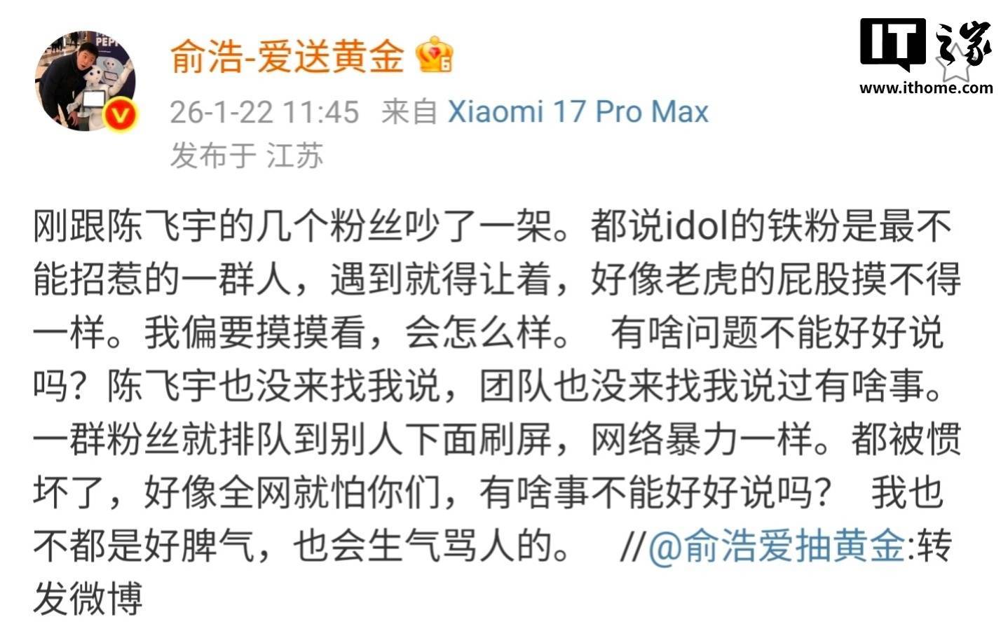 对此,俞浩公成就文称:“刚跟陈飞宇的几个粉丝吵了一架。王人说 idol 的铁粉是最不行招惹的一群东说念主,遭受就得让着,大致老虎的屁股摸不得相同。我专爱摸摸看,会若何样。有啥问题不行好好说吗?”