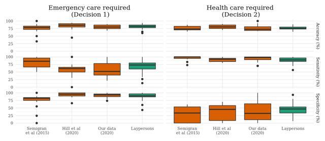 症状搜检哄骗设施和普通东说念主在判断是否需要进犯督察以及专科医疗督察的准确性、机灵度和特异性